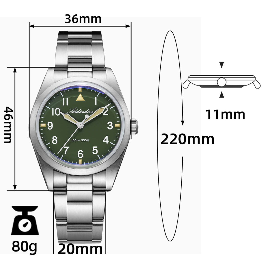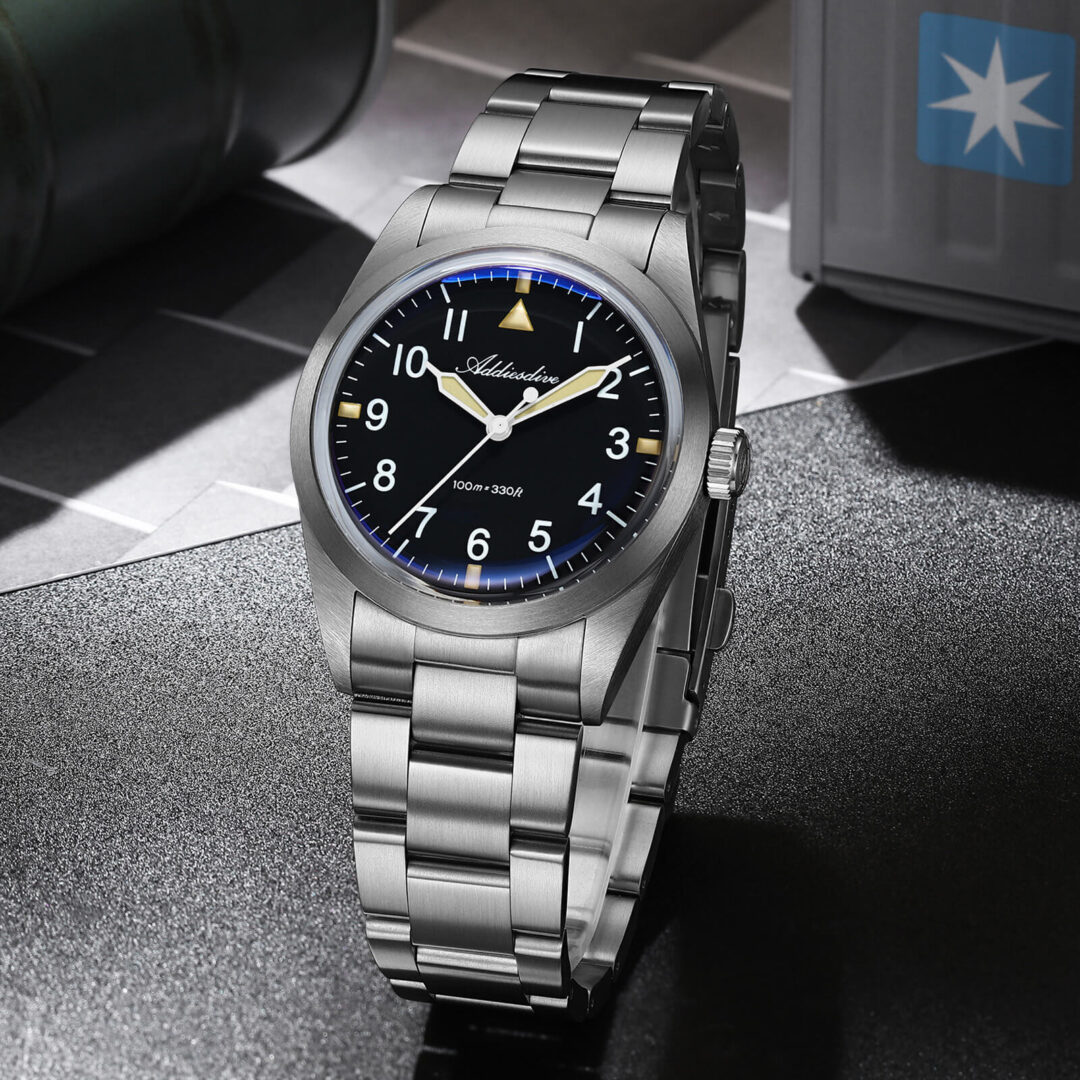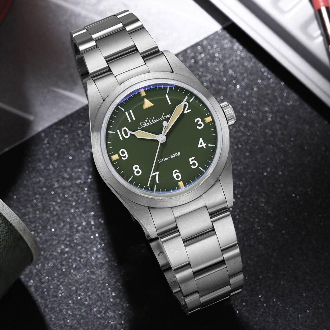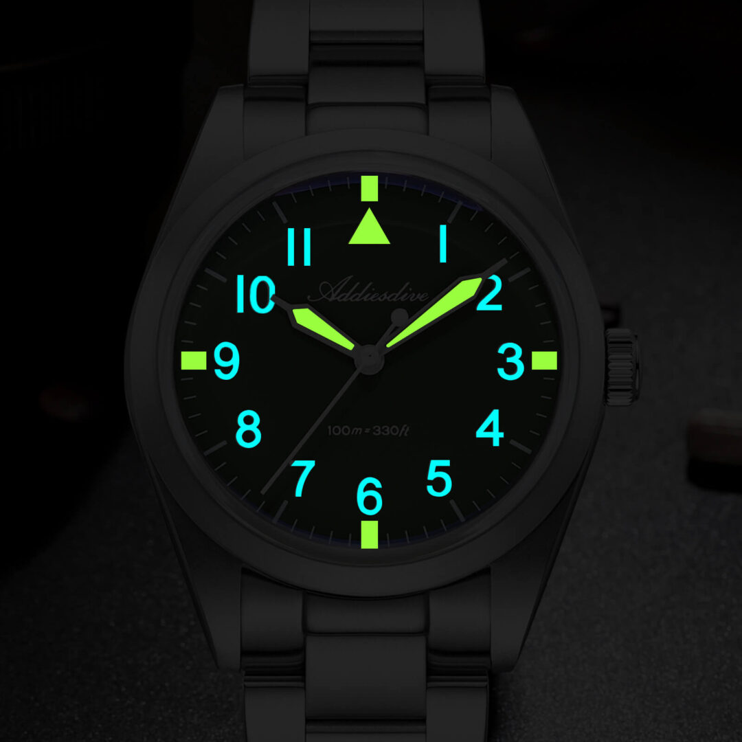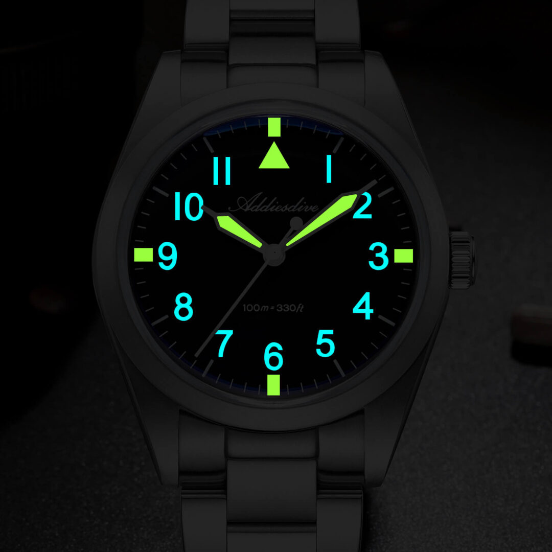 Inspired by classic military gear, the AD2502 combines rugged durability with lightweight titanium construction. Its matte brushed titanium case and bracelet deliver exceptional strength, corrosion resistance, and comfort on the wrist. The deep military green dial paired with BGW9 blue lume and C3 green lume creates a striking dual-color glow, offering a modern twist on traditional field watch design.