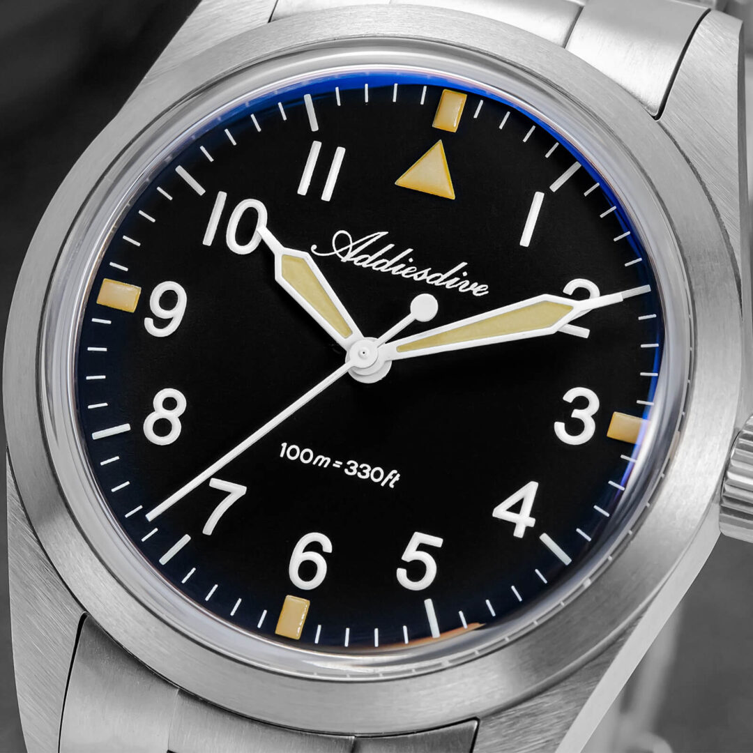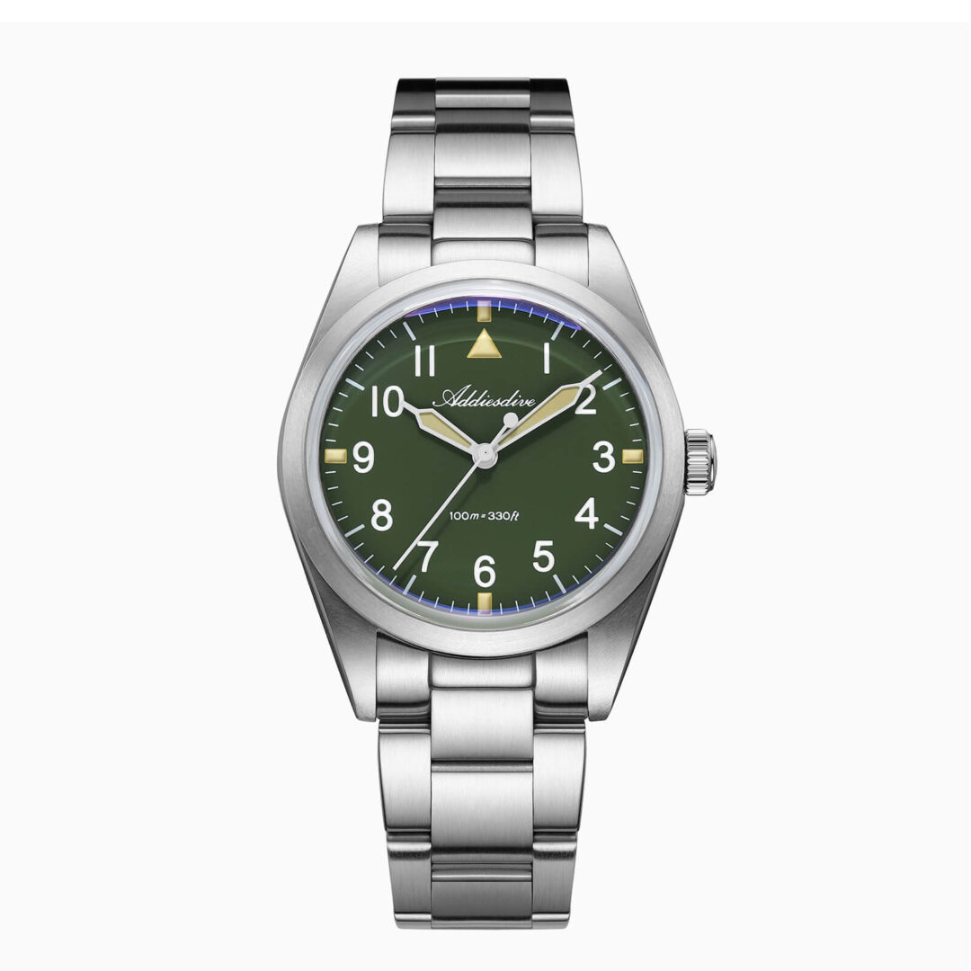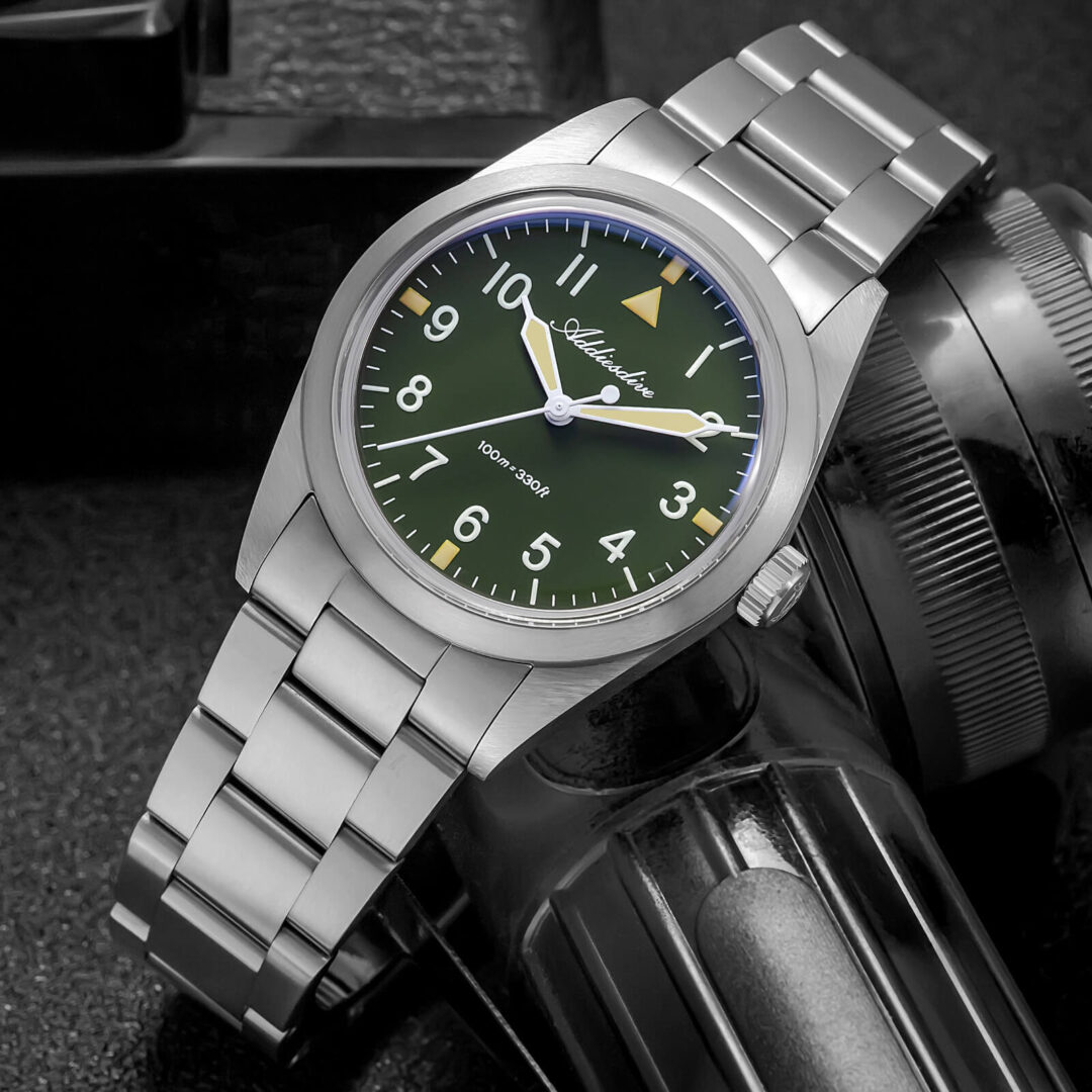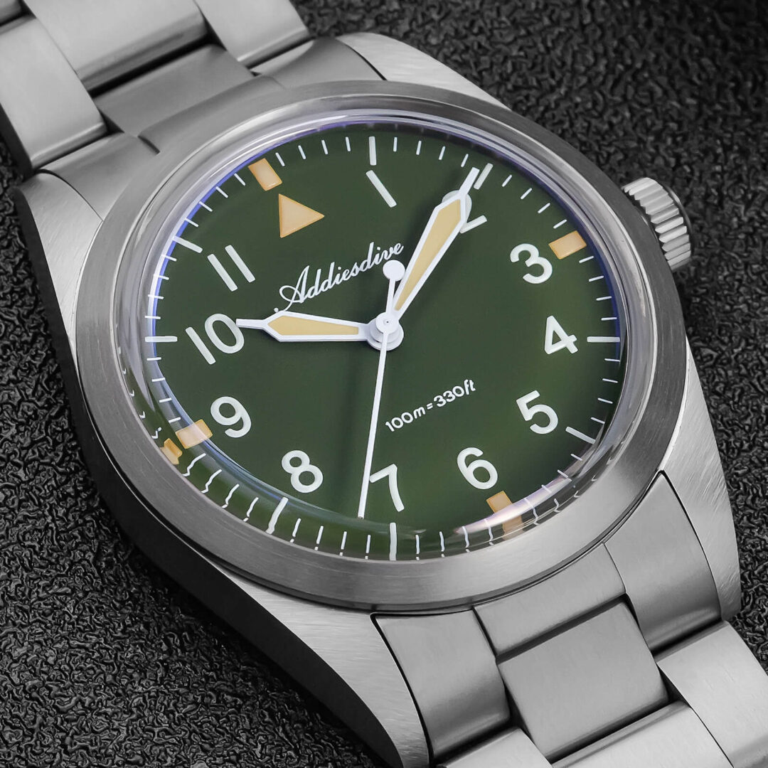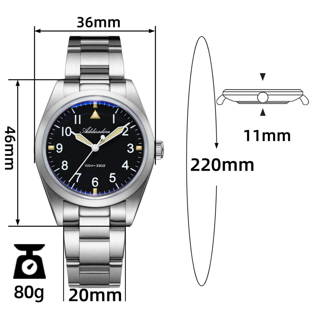 Inspired by classic military gear, the AD2502 combines rugged durability with lightweight titanium construction. Its matte brushed titanium case and bracelet deliver exceptional strength, corrosion resistance, and comfort on the wrist. The deep military green dial paired with BGW9 blue lume and C3 green lume creates a striking dual-color glow, offering a modern twist on traditional field watch design.
