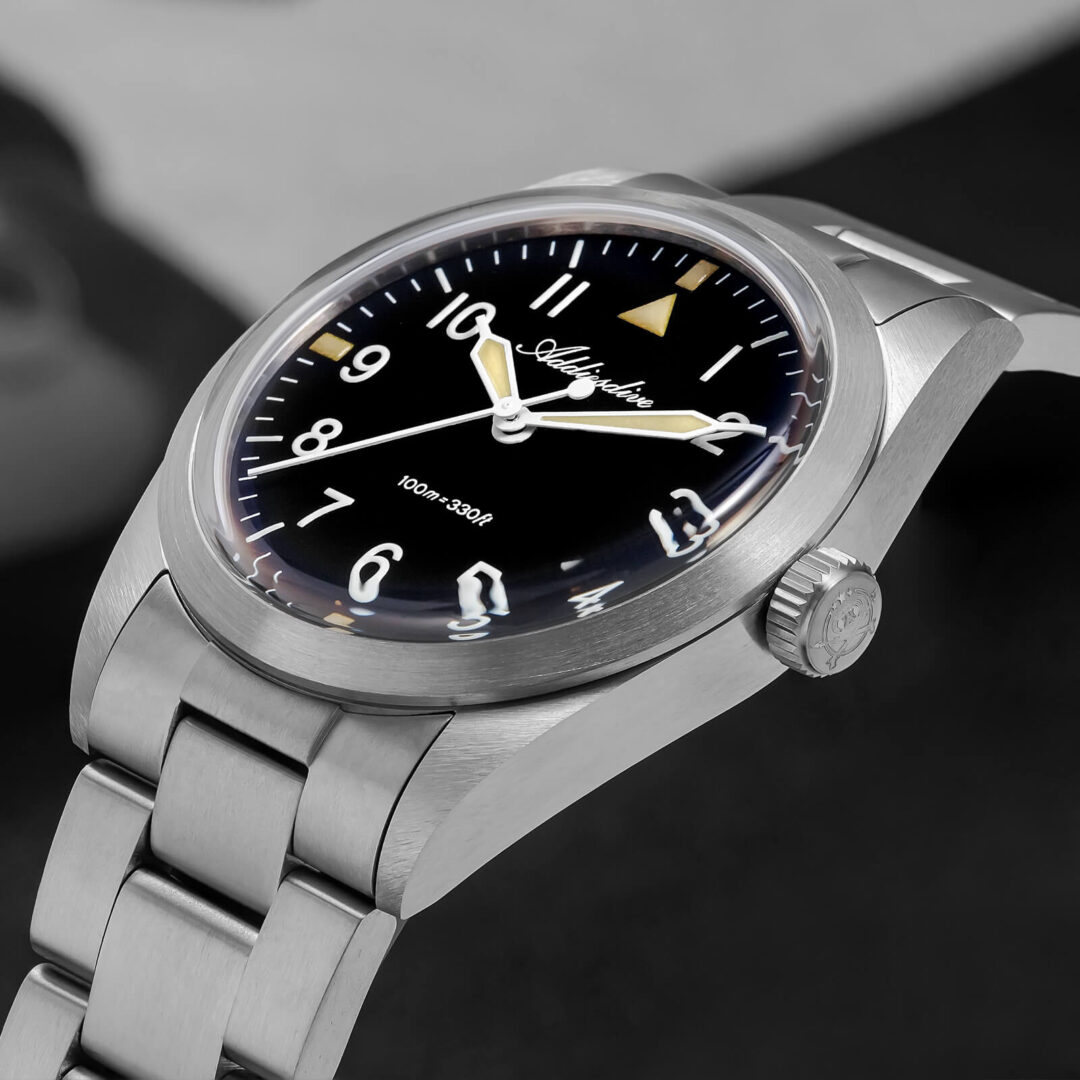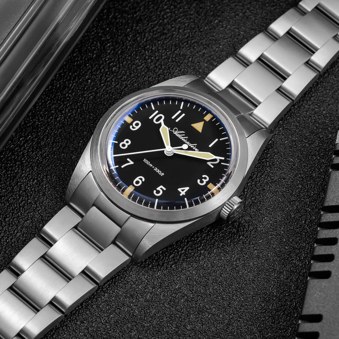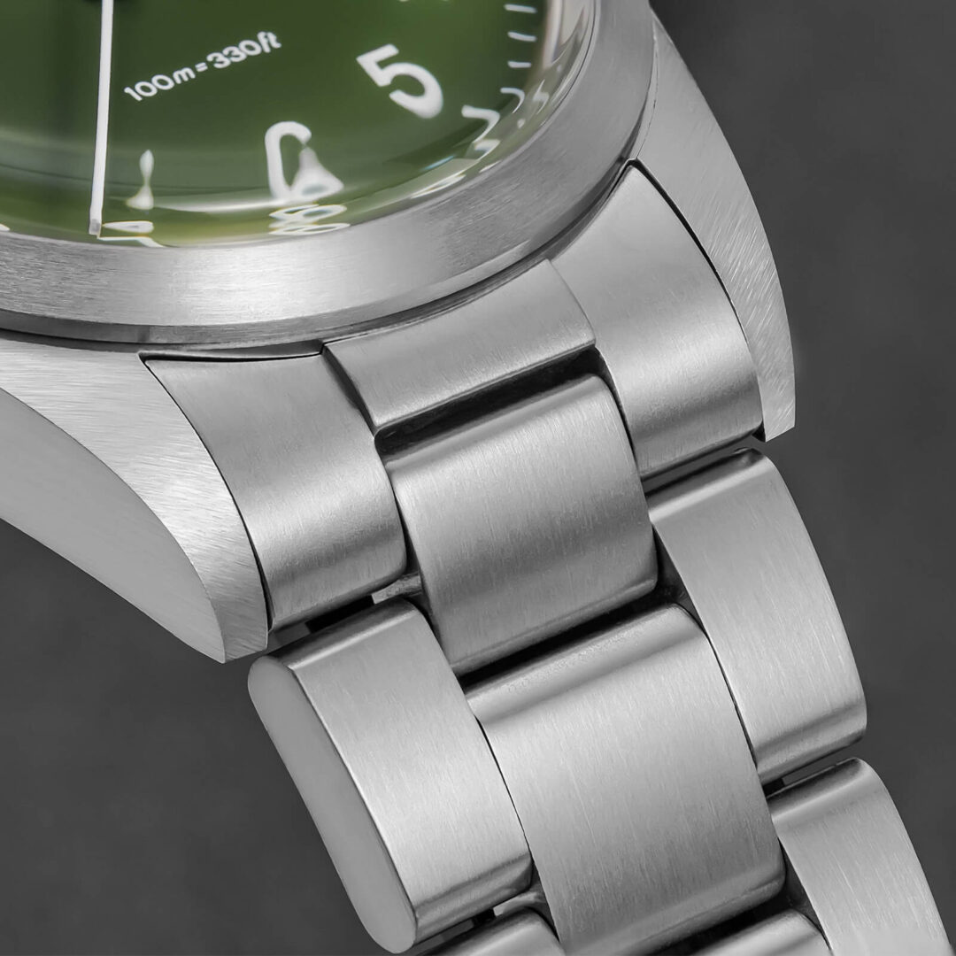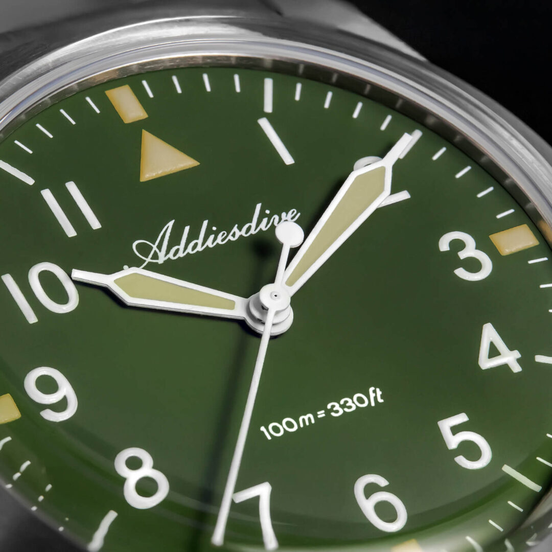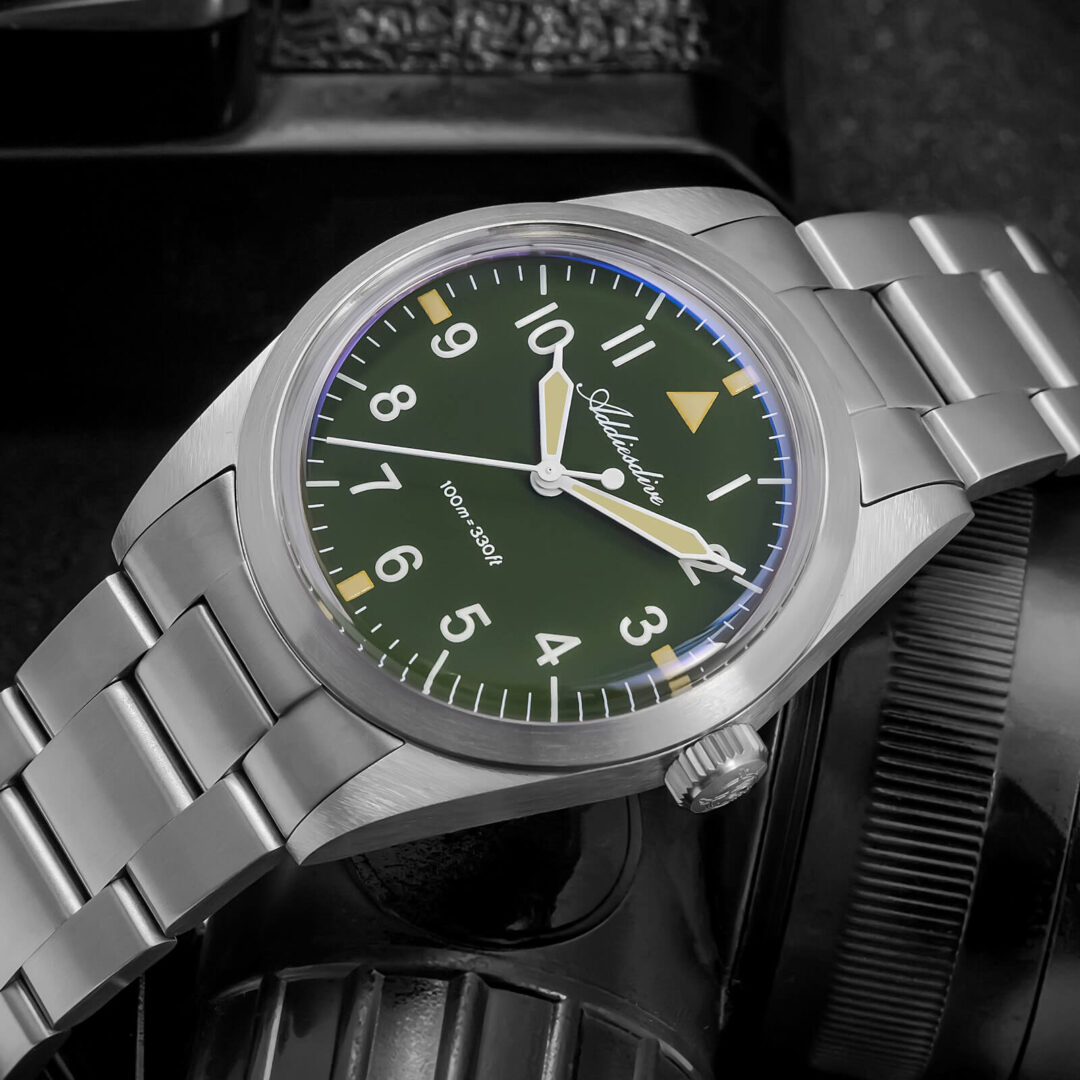 Inspired by classic military gear, the AD2502 combines rugged durability with lightweight titanium construction. Its matte brushed titanium case and bracelet deliver exceptional strength, corrosion resistance, and comfort on the wrist. The deep military green dial paired with BGW9 blue lume and C3 green lume creates a striking dual-color glow, offering a modern twist on traditional field watch design.