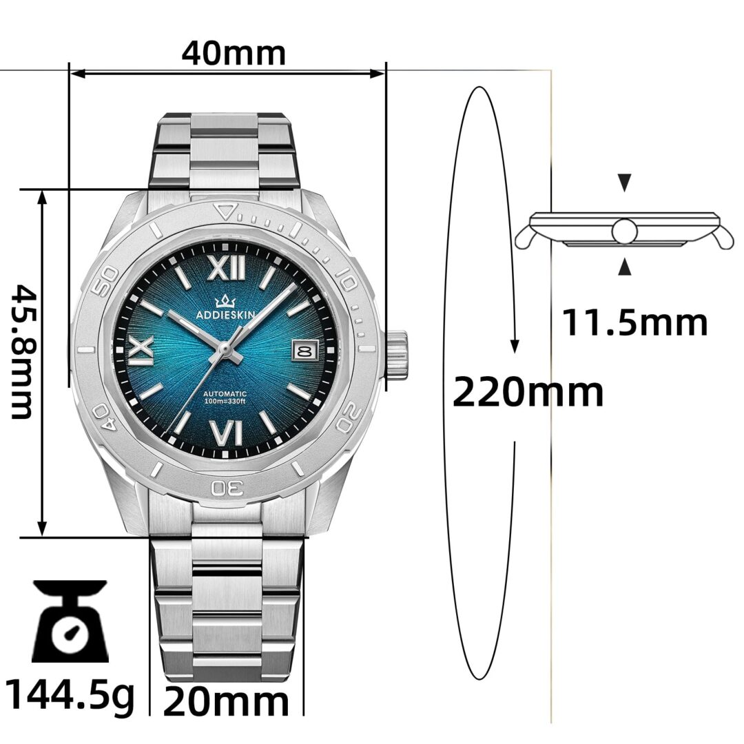 Movement: Japan Miyota 9015 Automatic Movement, 3 hands + date, 28,800 vph (4Hz), hacking, manual & automatic winding, quick date setting, 24 jewels, 42-hour power reserve.